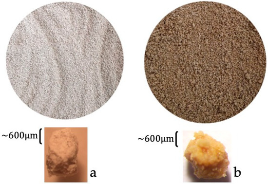 (a) Granules of Lecce Stone before the impregnation process; (b) granules of Lecce Stone impregnated with PEG800 (i.e., LS/PEG800).