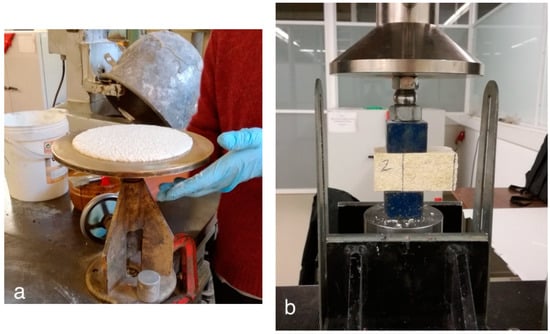 The mechanical characteristics of the cured mortars were, finally, determined (Figure 4b). The mechanical properties were measured in flexural and compression mode, following the EN 1015-11 standard [34]. For each of the mortar formulations reported in Table 1, 3 prismatic specimens (40 × 40 × 160 mm3) were tested. The flexural and compression tests were performed employing a Lloyd dynamometer instrument (LR50K Plus by Ametek Company, Berwyn, PA, USA) at speeds of 6 μm/s and 12 μm/s, respectively.
