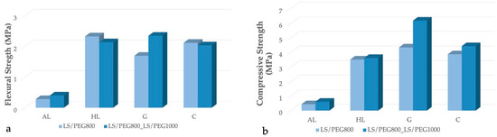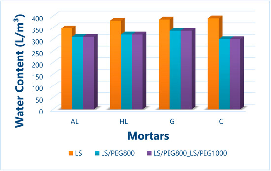 As can be seen in Figure 5, the mortar formulations based on the same binder and containing one of the two PCMs, i.e., LS/PEG800 or LS/PEG800_ LS/PEG1000, were manufactured with the same water content. In this way, it was possible to assess the effect of the employed PCM system on the properties of mortars in the fresh state, as well as in the hardened state. Upon the addition of both PCMs, a decrease in the water content needed to achieve suitable values of workability was recorded with respect to the control mortars. The greatest reduction in water was observed for the mortar based on cement. This behavior could be attributed to small portions of the PEG800 polymer possessing a low viscosity at room temperature [27], with portions lying on the surface of the Lecce Stone grains that can contribute to improving the workability of the mortar mix with replacement of a limited amount of the required water. This feature can, nevertheless, represent an important advantage, potentially counteracting the detrimental effects on mechanical properties brought about by the addition of a PCM in the mortars, as previously reported [26,37,38,39].