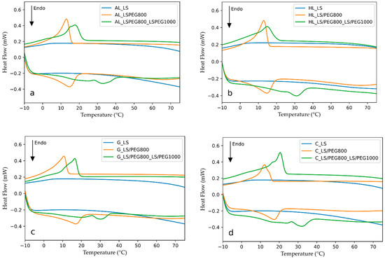 DSC curves recorded for mortars, containing LS/PEG800 and LS/PEG800_ LS/PEG1000 PCM composites or not, based on (a) aerial lime; (b) hydraulic lime; (c) gypsum; (d) cement.