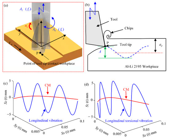 Figure 2a shows the schematic diagram of longitudinal torsional ultrasonic vibration milling process. The analysis of the cutting edge trajectory during ultrasonic milling is essential for the analysis of milling forces in milling tests. The radius of the tool is R, the tool tooth number is N, and the coordinate system O-xyz is established between the tool and the center point of the surface contacted by the 2195 Al-Li specimen, where the point P on the edge of the end mill is used as the reference point. The x-direction is the radial direction, the y-direction is the tool feed direction, and the z-direction as the direction of applied ultrasonic vibration. We define A as the amplitude of ultrasonic vibration, Al as the amplitude of longitudinal vibration and fl as the frequency of longitudinal vibration. Accordingly, At is the amplitude in the torsion direction and ft is the frequency in the torsion direction. The rotation speed of the spindle is ns and the speed in the feed direction is vw. The feed per tooth is fz and the depth of cut is ap.