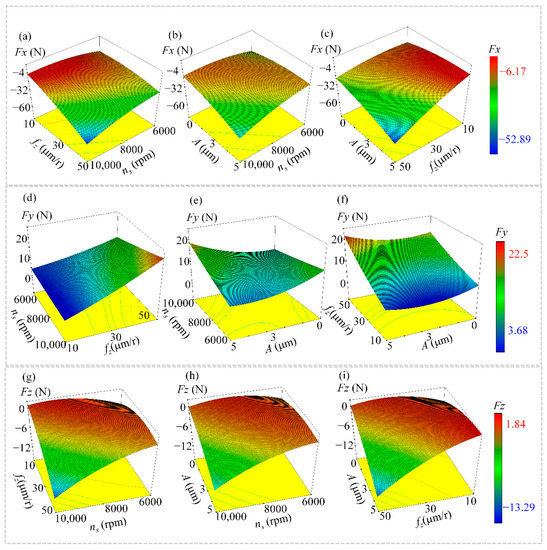 The coupled effects of milling parameters (ns, fz and A) on cutting forces Fx, Fy and Fz. (a,d,g) Interactive effect of feed per tooth and spindle speed on milling force Fx, Fy, Fz; (b,e,h) Interactive effect of ultrasonic amplitude and spindle speed on milling force Fx, Fy, Fz; (c,f,i) Interactive effects of ultrasonic amplitude and feed per tooth on milling forces Fx, Fy, Fz.