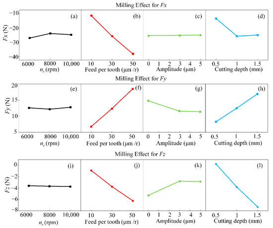 Main effects of various milling parameters on milling forces Fx, Fy and Fz. (a,e,i) Effect of spindle speed on milling forces Fx, Fy and Fz under polarization difference analysis; (b,f,j) Effect of feeds per tooth on milling forces Fx, Fy and Fz under polarization difference analysis; (c,g,k) Effect of ultrasonic amplitude on milling forces Fx, Fy and Fz under polarization difference analysis; (d,h,l) Effect of ultrasonic cutting depth on milling forces Fx, Fy and Fz under polarization difference analysis.