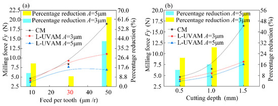 (1) In general, cutting depth directly affects the amount of milling force. Exploring the effects of milling speed, feed per tooth and ultrasonic amplitude on the interaction of milling forces revealed that higher speeds with fz = 50 μm and lower speeds with fz = 10 μm both have a significant effect on milling forces Fx and Fy. Both L-UVAM milling with A = 5 μm at fz = 10 μm and CM machining with fz = 50 μm decreased Fz.