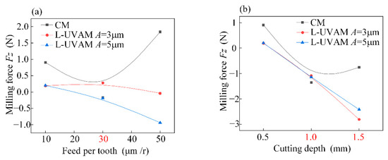 Figure 7 shows the single factor analysis of the milling force Fz. As shown in Figure 7a,b, the milling force Fz for conventional milling (CM) has a tendency to increase and then decrease followed by an increase due to the increase in feed per tooth and cutting depth; the milling force is minimal at fz = 30 mm and ap = 1 mm. The contact-separation characteristic of the longitudinal vibration causes a change in the depth of cut in the vertical direction, which causes the milling force to change to the opposite direction. Higher amplitude leads to higher longitudinal high-frequency shocks and more pronounced contact-separation characteristics.