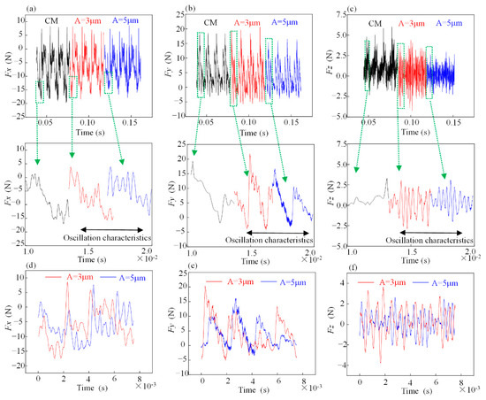 Single-factor test on the milling force signal (ns = 8000 r/min, fz = 10 μm, ap = 0.5 mm). (a–c) The collected milling force signals Fx, Fy and Fz; (d–f) Milling force signals of Fx, Fy and Fz at amplitudes A = 3 μm and A = 5 μm during one cycle of tool tip contact with the workpiece.