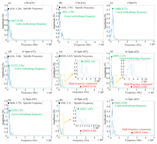 To investigate the effect of ultrasonic vibration with different amplitudes on the spectral characteristics of milling forces, the fast Fourier transform (FFT) was performed for conventional milling, as shown in Figure 9a–c, and ultrasonic milling was performed with ultrasonic amplitudes A = 3 μm in Figure 9d, Figure 9e and Figure 9f, and A = 5 μm in Figure 9g, Figure 9h and Figure 9i, respectively.