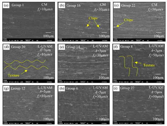 The magnitude of the milling force has a direct correlation to the surface topography. Figure 10 shows the microscopic morphology images of CM and L-UVAM machined surfaces observed by scanning electron microscopy. As the images of the surface morphology in Figure 10a–c show, there are obvious tool marks on the CM machined surface. The increase in feed per tooth increases the milling force, the chip residue on the surface increases, and the lateral plastic flow of the machined surface material becomes more severe, resulting in significant scraping. As shown in Figure 10d–f, the surface topography is changed due to the reduction of milling force at fz = 10 μm and A = 3 mm. The torsional vibration smooths out the tool marks and creates a “sinusoidal” texture on the surface in the direction of the feed. As shown in Figure 10g–i, increasing amplitude causes higher density of traces left by the tool trajectory, surface smearing effect is more obvious, in addition, the impact load increases to increase the material removal rate and reduce the surface chips. Ultrasonic vibration creates a unique texture on the workpiece, which efficiently removes chips and also reduces surface roughness, ultimately improving the surface quality of the workpiece and frictional wear and other characteristics.