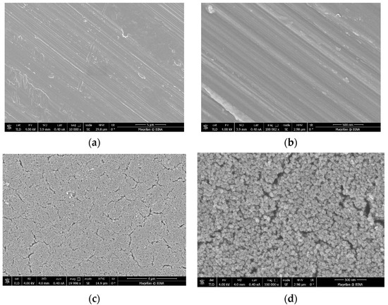 Images taken by high-resolution scanning microscopy (HRSEM) of (a,b) a disc before the coating process under low (10 K) and high (100 K) magnification, respectively, and (c,d) a coated disc under low (20 K) and high (100 K) magnification, respectively.