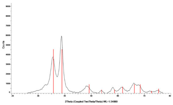XRD pattern of Zn–CuO NPs; the red lines belong to the monoclinic CuO phase.