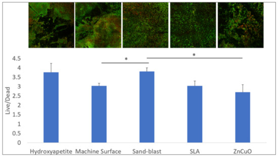 Confocal microscopy analysis of the live/dead assay in the biofilms grown on machined, sandblasted, SLA, and ZnCuO-coated titanium surfaces and hydroxyapatite discs after 14 days. Images showing staining of live bacteria in green and dead bacteria in red; bars showing the ratio of live to dead bacteria, expressed as the mean + SD (n = 4; asterisk indicates p < 0.05).