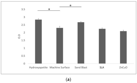 Osteoblast-like cell proliferation (XTT assay) on hydroxyapatite, sandblasted, SLA, and ZnCuO-coated surfaces was 1.1-, 1.23-, 1.31-, 1.4-fold higher than that on the machined control surface, respectively (Figure 5a). ALP activity was significantly higher in the cells cultured on the ZnCuO-coated and sandblasted surfaces than on the machined surface (1.2- and 1.19-fold, respectively) (Figure 5b).