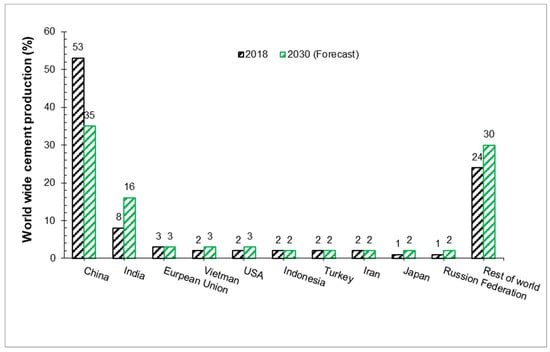 - World Cement Association. World Wide Cement Production 2018 & Forecast 2030. Available online: https://www.worldcementassociation.org/images/info-graphics/001-World-Wide-Cement-Production.pdf (accessed on 29 January 2022).