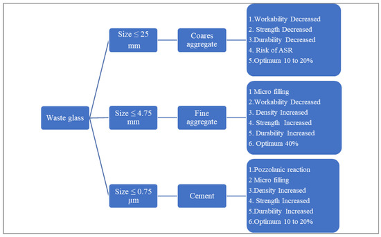Waste glass can be used as a cement replacement or as filler material (aggregate) in cement concrete production. However, the results depend on the particle size of waste glass, substitution rate, and chemical composition, which must be considered during the mix design. Figure 2 shows the role of waste glass in concrete.