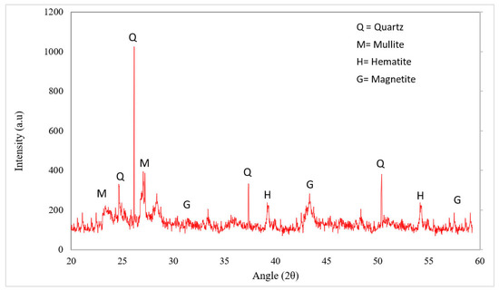 Mechanical and durability performance of concrete with waste glass also depends on the percentage of different chemicals present in waste glass. A study reported that the pozzolanic activity of waste glass mainly depends on chemical composition and particle size [49]. Table 1 shows the chemical composition of waste glass as per past studies. It can be observed that the main chemical composition of waste glass lies in the range of SiO2 (70 to 75%), CaO (8 to 10%), Al2O3 (1 to 3%), MgO (1.5 to 3%), NaO2 (0 to 15%), and Fe2O3 (0.5 to 1%) [50,51,52]. The amorphous nature of SIO2 present in waste glass plays a vital role in the performance of concrete, starting from hydration up to the final development of strength [49]. According to ASTM [53], the accumulation of a chemical (SiO2, CaO, Al2O3, MgO, NaO2, and Fe2O3) up to more than 70% can be used as pozzolanic material waste glass containing more than 70%. Figure 3 shows the XRD results of waste glass. A major peak of quartz (SiO2) was observed at 27-degree angles. Some minor peaks were also observed at different angles, which shows the amorphous nature of waste glass. A study concluded that the peak heat flow during the hydration process and Ca(OH)2 decreased with the substitution of waste glass as a binding material, which undoubtfully improved mechanical performance [54]. However, the pozzolanic activity of waste glass is mainly dependent on particle size. A study was carried out on different particle sizes of waste glass (300 to 38 mm) and the pozzolanic activity of waste glass on the particle size below 150 mm was observed. Furthermore, a study concluded that the pozzolanic activity of waste glass increased with the decreasing particle size of waste glass. The maximum pozzolanic activity was observed at 38 mm particle size of waste glass. Moreover, it also indicated that higher doses of waste glass can cause alkali silica reactions (ASR) due to a deficiency of calcium hydrate [49]. It has been also reported that higher doses of waste glass decreased the mechanical performance of concrete due to dilution effects, which caused the alkali silica reaction [55]. Therefore, it important to choose the optimum dose of waste glass.