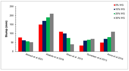 Slump with different percentages of waste glass [49,60,61,62,63].