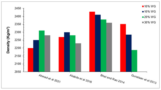 The density of concrete with different percentages of waste glass [49,60,61,67].