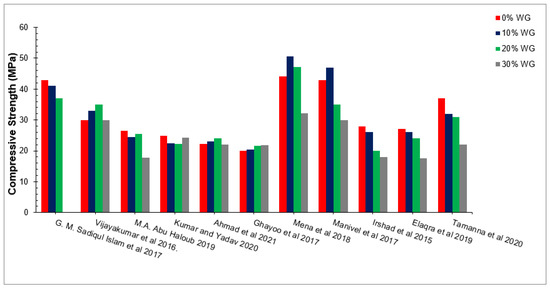 Compressive strength of concrete with different percentages of waste glass [49,56,70,71,72,73,74,75,76].