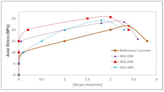 The stress–strain curve of different replacement ratios of WG is shown in Figure 7. The tension necessary to produce the initial strain in WG was significantly greater than the tension required in the control concrete. The secondary cementitious compound (CSH) was formed due to the pozzolanic reaction. CSH improved the binding characteristics of the paste; thus, a larger load was needed to begin strain in the paste. A further factor that contributed to the increase in the initial strain was the micro-filling effects of WG, which resulted in a more compact mass. Similarly, due to the combination of pozzolanic reactions and micro filling of WG, the ultimate stress was enhanced with the replacement of WG up to 20% and then reduced due to lower flowability. Despite the fact that the waste glass increased ultimate stresses significantly, the ultimate strain was reduced with the replacement of the WG, which resulted in the brittle failure of concrete. Hence, it is recommended that certain tensile reinforcement (fibers) could be added to increase the concrete’s tensile strength (ductile failure). As shown in Figure 7, both reference concrete and concrete made with waste exhibited approximately the same stress–strain curve in the descending portion of the curve.
