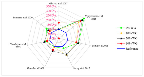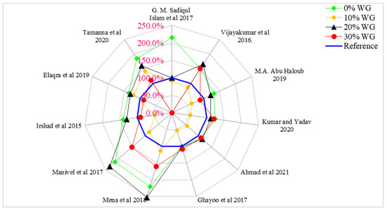 Figure 8 shows the relative compressive capacity of concrete with distinct doses of WG (0%, 10%, 20%, and 30%), in which 20 MPa compressive strength is considered the reference strength. According to Islam et al. [70], the compressive strength of concrete is approximately equal to the reference strength (20 MPa) at 20% of waste glass. Vijayakumar et al. [71] observed 65% more compressive strength than the reference strength at 20% replacement of WG. Haloub et al. [72], Kumar et al. [73], Ahmad et al. [49], and Ghayoo et al. [74] observed approximately 15% more compressive strength than the reference strength at 20% replacement of WG. The maximum compressive capacity was noted by Mena and Manivel [75], which was about 150% more than compared to the control strength. Irshad and Elaqra [72] noted 30% more compressive strength than the reference strength, while Tamanna [76] observed 85% more compressive strength at 20% substitution of waste glass compared to the reference strength. The various differences in compressive strength with respect to different researchers is due to changes in mix design, water-cement ratio, types of aggregate, temperature, and humidity, etc.