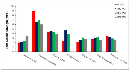 According to Ghayoo et al. [74], the split tensile strength of concrete is approximately equal to the reference strength (2.0 MPa) at 20% of waste glass. Vijayakumar et al. [71] observed 225% more split tensile strength than reference strengths at 20% substitution of waste glass. Mena et al. [75] observed approximately 115% more split tensile strength than the reference strength at 20% substitution of waste glass. Seong et al. [83] observed 95% more than compared to the reference strength. Ahmad et al. [49] Vandhiyan et al. [77] and Tamanna et al. [76] observed 55%, 60%, and 45% more split tensile strength compared to the reference strength. The various differences in compressive strength with respect to different researchers are due to changes in mix design, water-cement ratio, and environmental aspects such as temperature and humidity, etc. It can also be observed that waste glass improved compressive strengths more effectively than split tensile strength. Therefore, we recommend adding some tensile reinforcements to enhance the tensile capacities of concrete before its practical application.