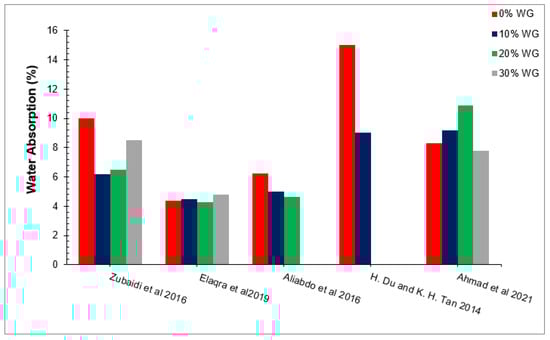 Water absorption tests can be used to determine the durability of concrete. Water includes a toxic chemical that, when combined with other chemicals contained in cement concrete, can cause concrete disintegration. Furthermore, water absorption generates freeze and thaw actions, which add stress to the surrounding concrete, resulting in less durable concrete. According to one study, water absorption is one of the reasons for alkali–silica reactions [88]. Figure 11 shows the water absorption of concrete with varying doses of waste glass as per past studies [49,60,72,89,90]. It can be observed that waste glass decreased the water absorption of concrete due to micro filling and pozzolanic reactions [49]. A study concluded that water absorption decreased as the percentages of waste glass increased, having minimum water absorption at 10% substitution of waste glass [80]. A study observed that the water absorption of concrete decreased compared to the reference concrete for both grades of concrete (m20 and m30) [79]. However, a study observed that an increase in porosity was observed as the percentages of waste glass increased. The increase in porosity results in greater water absorption [91]. A study concluded that waste glass as cement replacement decreased porosity, resulting in more water absorption [92]. According to one study, the highest water absorption of concrete was recorded at 0% substitution of waste glass. The smallest water absorption of concrete was observed at 20% substitution of waste glass. The decrease in water absorption of concrete with waste glass replacement is due to the pozzolanic reaction of waste glass, which improves the binding qualities of cement paste. Furthermore, the micro filling of waste glass results in more dense concrete filling the voids between concrete ingredients, resulting in less water absorption. However, an increase in water absorption was observed at a greater dose of waste glass (30%) due to a lack of workability, which increased compaction efforts, resulting in more voids in hardened concrete and in more water absorption [49]. As a result, a higher dose of superplasticizer is required for a higher dose of waste glass.