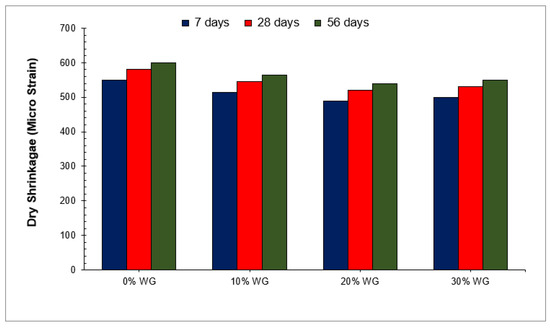 A dry shrinkage test may also be used to determine the durability of concrete. Water and other potentially dangerous compounds can quickly enter the concrete through microscopic surface cracks created by dry shrinkage. The availability of internal water, aggregate types, and voids in concrete all influence dry shrinkage. Generally, the dry shrinkage of waste glass is less than conventional concrete. A study reported that concrete with 20% waste glass as a cement replacement shows 50% less dry shrinkage [93]. Similarly, Figure 12 shows the minimum dry shrinkage at 20% substitution of waste glass [49]. It is due to the stiff nature of waste glass and the rough surface texture, which is strongly interlocked with paste. However, due to the larger particle size (more than 200 mm), internal voids increased the dry shrinkage, particularly at high temperatures. Therefore, it is recommended that finer used waste glass should be used, possessing a particle size of fewer than 75 microns. A study also reported that finer waste glass improved the performance of concrete more effectively than larger particles due to micro filling and pozzolanic reaction [49]. Research also discovered that waste glass reduces drying shrinkage by filling holes in concrete materials, which improves the internal compactness of concrete [55]. It was also shown that dry shrinkage after 28 days (56 and 90 days) was almost equivalent to dry shrinkage at 28 days. It has also been observed that the dry shrinkage rate is higher in the first 7 days and decreases or remains constant with age [88]. The previous study has shown that coarse aggregate inhibits dry shrinkage, and dry shrinkage is caused mostly by the movement of cement mortar [55]. The production of secondary C-S-H due to the substitution of waste glass increased the viscosity of cement paste, which reduced the mobility of the paste. Furthermore, the use of waste glass reduced the heat of hydration, which reduced the evaporation rate of water from the concrete’s surface, resulting in lower dry shrinkage cracks [49]. A study also shows that dry shrinkage is due to the evaporation of internal water rather than surface water [2]. The density of concrete depends upon the consistency of the material; materials such as geopolymer when used in concrete do not have well-enclosed pores, and due to these pores, water losses occur and in less than 90 days, major shrinkage occurs. For that reason, highly fine base materials result in shrinkages stresses and high strain.