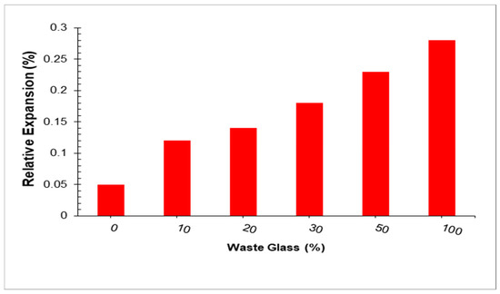 The ASR gel creates expanding strains along the reaction zone that may exceed the concrete’s tensile strength restriction, allowing cracks to arise. As a result, an extra opportunity for penetration and absorption of the external solution is produced, lowering the durability. Serpa et al. [104] used Portuguese recycled glass to partially substitute natural fine aggregate in mortars at values of 0%, 5%, and 20% by weight. The findings indicate that substituting natural fine aggregate with waste glass did not result in higher ASR expansion at 14 days but did result in a modest rise at 28 days. As glass content increased, expansion also increased. Limbachiya et al. [105] investigated the ASR expansion of concretes incorporating mixed color beverage glass (size 5 mm) as a natural sand replacement at levels of 0%, 5%, 10%, 15%, and 20% by weight at ages 3, 7, and 14 days. According to the findings, ASR expansion increased as the glass sand content increased [104]. Idir et al. [106] investigated the ASR expansion of mortars by incorporating waste glass as a natural fine aggregate replacement at 20% and 40% weight ratios. Kou and Poon [107] used cullet waste beverage glass bottles (size 5 mm) to partially substitute sand in mortars at weight levels of 0, 15, 30, and 45%. ASR expansion increased with increasing glass sand content. Oliveira et al. [108] reported that ASR expansion of concretes containing amber glass (maximum particle size 4.76 mm) as natural sand replacements increased with increasing glass sand content. Ling and Poon [109] reported an increase in the ASR expansion of mortar containing 100% beverage waste glass (size < 5 mm) as fine aggregates. According to Park et al. [110], the expansion rate measured via ASR expansion in line with ASTM C 1260 [111] increased with increasing emerald, green waste glass (size 5 mm). Figure 13 shows that the relative expansion with waste glass is reported by Park et al. [110]. With the addition of 10, 20, 30, 50, and 100% glass sand, the expansion of mortar specimens increased by approximately 85.7%, 116.67%, 159.76%, 228.5%, and 285.71%, respectively. Ling et al. [112] found that using waste glass (about 23% coarser particles 10–5 mm) as a natural sand substitute at 25%, 50%, 75%, and 100% by weight increased the ASR expansion of mortars. With increasing glass sand content, ASR growth increased. Shayan and Xu [113] used recycled waste glass (size 4.75–0.15 mm) to replace natural fine aggregate in mortars at amounts ranging from 0% to 100% by weight, with a 10% increment. The ASR expansion data revealed that the higher the glass concentration in mortar bars, the greater the expansion. Jin et al. [114] investigated the ASR expansion of mortars by incorporating transparent soda-lime glass as a natural sand replacement at amounts ranging from 0% to 100% with a 10% increment by weight for up to 14 days. With increased glass sand contents, ASR expanded further. The ASR expansion of mortars incorporating waste glass as a natural fine aggregate replacement was investigated by Topcu et al. [115]. Waste glass (size 4.75–0.3 mm) was substituted by natural sand. With increased glass sand contents, ASR expanded further at the ages of 14 and 21 days, Degirmenci et al. [116] investigated the ASR growth of mortars containing 10, 30, and 100% glass sand. The growth of ASR increased as glass sand content increased. Ismail and Al-Hashmi [65] used crushed waste glass (size 4.75–0.15 mm) to partially substitute natural sand in concrete at weight levels of 0, 10, 15, and 20%. According to the findings, the presence of discarded glass lowered ASR growth. As the volume of discarded glass increased, ASR decrease. Glass sand content has a substantial influence on ASR growth.