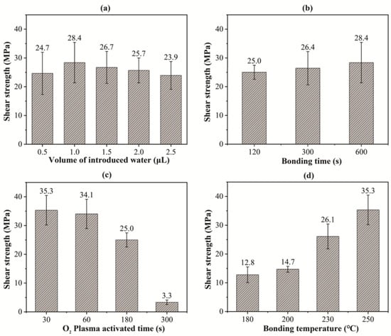 As bonding strength is a primary indicator to evaluate the reliability of vertical interconnections, the bonding process was optimized based on shear tests. The influence of volume of the introduced water, bonding time, plasma activation time, and bonding temperature on shear strength is shown in Figure 3. First, the oxygen plasma activation was set to 150 W, 180 s, and deionized water was dropped at the polyimide surfaces with different volumes (0.5–2.5 μL). The bonding temperature, the bonding time, and the pressure were set to 250 °C, 600 s, and 30 MPa, respectively. The influence of the water volume on shear strength is shown in Figure 3a. It is seen that the shear strength slightly changed with different volumes of induced water, and 1 μL of water appeared slightly superior. For the following experiments, the water volume was fixed at 1.0 μL.