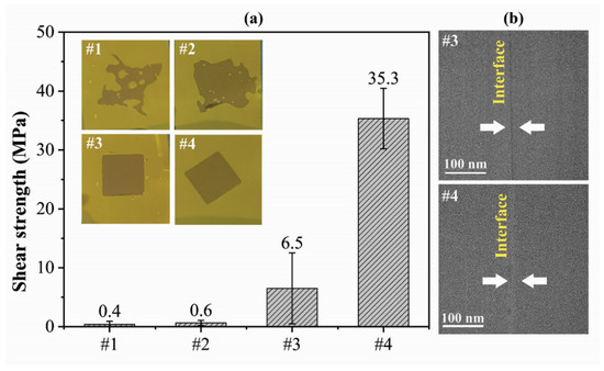 (a) The shear strength of specimens obtained in the comparative tests of Table 1; the inset images show the specimens after bonding under different conditions; (b) interface characterization of sample #3 and #4.