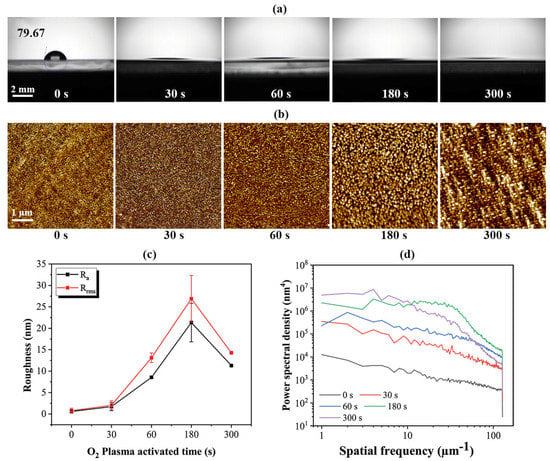 The oxygen plasma activation is supposed to raise the hydrophilicity of the polyimide, and its effects were evaluated by the water-drop test. Deionized water was dropped on the polyimide surface after plasma activation of 0 s, 30 s, 60 s, 180 s, and 300 s, and the contact angles between the droplets and the surface were fit semi-automatically by capturing a picture, as shown in Figure 5a. The contact angle of polyimide before plasma activation was 79.67°, indicating the poor hydrophilicity of polyimide. The hydrophilicity was significantly improved after plasma activation of over 30 s, as the contact angle greatly decreased to below the measurement limit (10°). A further extension of activation time barely changed the contact angles.