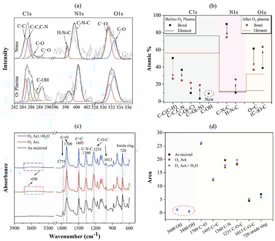 In addition, the FTIR results of the polyimide before and after plasma activation are shown in Figure 6c,d. In both samples, the C=O bending in the imide ring at 720 cm−1; the C−O−C stretching and C−O−C asymmetrical stretching at 1013 cm−1 and 1231 cm−1, respectively; the C−N stretching at 1360 cm−1; the aromatic C=C ring stretching at 1495 cm−1; and the C=O asymmetrical stretching and C=O symmetrical stretching at peaks of 1709 cm−1 and 1775 cm−1, respectively, were detected. The area of C=O symmetrical stretching at 1775 cm−1 and the C−O−C stretching at 1231 cm−1 and 1013 cm−1 slightly increased after the plasma activation compared to functional groups as-received, while the area of the imide ring at 720 cm−1 and the C−N stretching 1360 cm−1 decreased. These results indicate that the oxygen plasma broke the bond of C−N−C and the imide ring, and reacted with the polyimide to produce new hydrophilic groups such as C=O and C−O. The results are consistent with those previously reported [27,28] where oxygen plasma will break the imide rings and phenyl groups at the surface of the polyimide film. Moreover, new OH groups were detected on the polyimide surface after plasma activation and the wetting process, as highlighted by the red circle in Figure 6d, and the surface after wetting also exhibited higher C−O−C and OH signals.