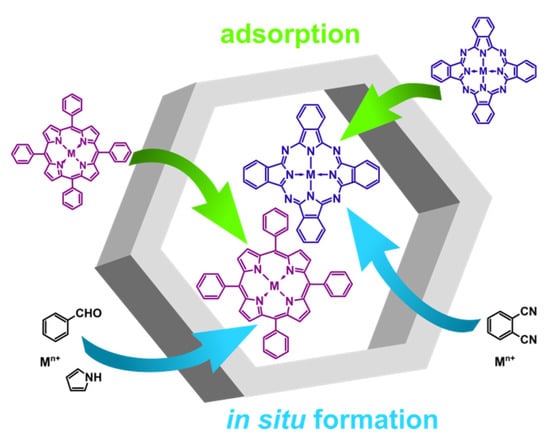 Porphyrins and phthalocyanines may be incorporated into mesopores by in situ process or adsorption (Figure 1). Frequently an anchoring group is employed. Adsorption on the surface of mesoporous material takes place through stirring mesoporous material and the macrocycle in solvent able to dissolve the macrocycle. Although there are several methods of immobilization this one is the simplest. To purify the complex obtained filtration and washing with an appropriate solvent is required, followed by drying the solid. The amount of the complex bonded to the mesoporous material can be evaluated on the basis of comparison of UV-Vis spectra of the solution recorded before and after the immobilization. Although this method is simple and does not require the modification of the support and catalyst it has its limitations. Layering and stacking of phthalocyanine can occur while using concentrated solution what prevents the access to the active site of the catalyst. It has to be taken into account while choosing this method.