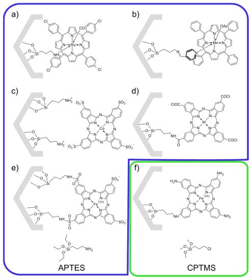 Porphyrins and phthalocyanines incorporated into mesoporous support modified with APTES (3-aminopropyltriethoxysilane)—(a) [36], (b) [39], (c) [40], (d) [41] (M = 2H, Zn, Cu, Ni, Co, Fe, Mn) and (e) [42] and with CPTES (3-chloropropyltriethoxysilane)—(f) [42].