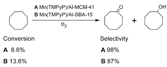 Chloromanganese(III) 5,10,15,20-tetrakis(4-N-methylopyridynio)porphiryn tetrachloride Mn(TMPyP) was immobilized on MCM-41 and SBA-15, both materials modified by alumination [51]. Used supports were aluminated by both direct and post-synthesis method. In direct method, aluminum was introduced during the mesoporous material synthesis, while in post-synthesis method purely siliceous materials were modified. The Mn-porphyrin has been encapsulated into aluminated mesoporous silicas by means of cationic exchange. The catalysts were tested in the oxidation of cyclooctane with molecular oxygen (10 atm, 120 °C), and the conversion rates and cyclooctanone/cyclooctanol selectivities were determined. All studied mesoporous materials showed higher catalytic activity than unsupported porphyrin. Interestingly, dependence between pore size and conversion rate was observed, for SBA-15 modified directly with aluminum it was as high as 11.8%. However, the cyclooctanone selectivity was the highest (97–98%) for the samples of MCM-41 modified post-synthetically with aluminum (Scheme 1). This result was attributed to the small size of the MCM-41 mesopores, which may prevent escape of free radicals from the solvent cage, thus leading to ketone formation [51].
