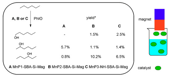 Oxidation of n-hexane using porphyins: MnP1-SBA-Si-Mag, MnP2-SBA-Si-Mag and MnP3-NH-SBA-Si-Mag modified with magnetite and their removing from reaction medium. MnP/PhIO/hexane molar ratios were of 1:50:5000, MeCN:CH2Cl2 (1:1, v/v), magnetic stirring under argon, 25 °C, 1h; * yields calculated based on PhIO [54].