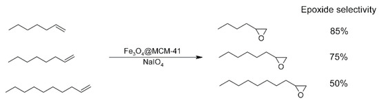 The chloromanganese(III) 5,10,15,20-tetraphenylporphyrin (MnTPPCl) is another example of deposition on a magnetite modified support [64]. Mesoporous silica MCM-41 was also functionalized with 3-chloropropyltriethoxysilane (CPTES) and imidazole, which allowed the axial ligation of porphyrin to mesoporous material. Prepared complex was used in the oxidation of numerous of cyclic and linear alkenes: cyclooctene, cyclohexene, styrene, α-methylstyrene, α-pinene, limonene, 1-hexene, 1-octene and 1-decene, with NaIO4 as oxidant. In typical experiment alkene (0.5 mmol), Fe3O4@MCM-41-Im@MnTPPCl (200 mg) and NaIO4 (1 mmol) were stirred in acetonitrile:water mixture (8 mL, 5:3 v/v). Conversion of the alkenes were up to 98% (for cyclooctene). In all reactions the epoxide was the main product with the highest yield. It was observed that in the case of linear alkenes oxidation, the epoxide yield decreased with the chain length (Scheme 8). This may be due to the reduced availability to the active site of the catalyst. The proposed combination of porphyrin with Fe3O4@MCM-41-Im support, showed good reusability without decrease in activity during catalytic cycle.