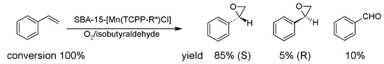 Further examples relate to the catalytic performance of porphyrins incorporated into SBA-15 and SBA-16 mesoporous material type. Manganese(III) porphyrin, bearing a tartrate moiety as a chiral center, covalently bonded with SBA-15 (SBA15-[Mn(TCPP-R*)Cl]) was prepared and studied its chiral recognition in olefins oxidation reaction, using O2/isobutyraldehyde as oxidant [66]. The obtained results indicate the enantioselectivity of studied composite SBA15-[Mn(TCPP-R*)Cl]. During the oxidation of styrene 90% epoxide selectivity were obtained with 89% enantiomeric excess (Scheme 9). The obtained values were higher than those of α- and β-methylstyrene. However, in the oxidation of α-methylstyrene the enantiomeric excess (81%) was higher than that of unsupported porphyrin catalyst (Mn(TCPP-R*)Cl) (70%). It suggests that mesoporous support has an effect on asymmetric catalysis. Moreover, it can be concluded that the use of chiral catalyst allows chirality to be introduced into the final product.
