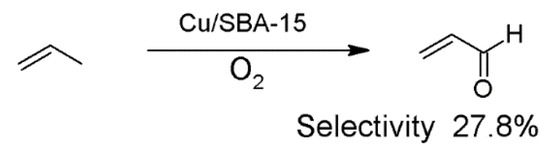 Very specific usage of copper tetrakis(methylpyridinium)phthalocyanine tetrachloride (CuPc) immobilized onto SBA-15 was implemented [71]. Mesoporous material with CuPc was calcined which led to the oxidation of phthalocyanine. The complexes of CuPc with SBA-15 with different loadings were tested under different reaction conditions. From among the complexes tested the most active was the containing the smallest amount of copper (0.06 wt% Cu). The oxidation selectivity towards acrolein (Scheme 10) increased with decreasing loading of copper (11% at 0.9 wt% Cu and 42% at 0.06 wt% Cu). It can be related to the fact that copper remains in a highly dispersed state attributed to the low copper loading which prevents aggregation. It is assumed that isolated copper sites are responsible for the selective oxidation reaction. The same authors have tested the influence of different reaction conditions on the effectiveness of oxidation process. The highest activity and selectivity was obtained at 475–500 °C. Additionally, with increasing oxygen partial pressure the selectivity to acrolein decreased (from 54.8% to 28.1%) and conversion increased took place (from 6.7% to 30.5%).