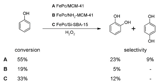 Iron(II) tetrasulfophthalocyanine (FePcS) was immobilized in APTES-modified MCM-48 and MCM-41 [72]. The complex was used as a catalyst for oxidation of styrene with TBHP leading to benzaldehyde. Mesoporous materials used varied in structure MCM-41 with the two-dimensional hexagonal array of pore channels and MCM-48 with three-dimensional pore network and larger surface area. The advantageous features of MCM-48 make it more favorable for the catalytic reaction, but it is difficult to obtain the material with controllable pore size and high quality. Catalytic procedure was as follows: styrene (0.025 mmol), mesoporous material (22 mg, 4% loading) and TBHP (0.025 mmol, added in portions) were stirred in water/methanol mixture (5 mL, 1:1 v/v) for 6 h at room temperature. Homogenous catalysis served as a comparison. The conversions in both systems were comparable but the homogeneous one gave benzoic acid as an undesirable product. The results confirmed that FePcS immobilized on MCM-48 showed higher activity than when grafted onto MCM-41 (Table 4). It can be related to the three-dimensional different pore structure of MCM-48, and thus better dispersion into the pores as such a pore structure provides easier access of guest molecules [72].