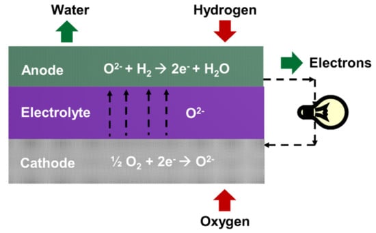 Solid oxide fuel cells (SOFCs) are attractive and promising energy conversion devices for electricity production because of their high efficiency, fuel flexibility, and absence of precious noble metal catalyst [,,]. A basic SOFC consists of a dense electrolyte, which is in contact with two porous and electro-catalytically active electrodes on either side (Figure 1) [,]. SOFCs operate at high temperatures (400–800 °C) and have numerous applications including residential, industrial, and transportation [,]. Currently, efforts are being made to reduce the operating temperature of SOFCs from 600 °C to 350 °C. Low temperature systems can save manufacturing cost by reducing the costs of insulation, materials, startup, and degradation. However, reduction of the operating temperature below 600 °C results in high electrolyte ohmic resistance and electrode polarization resistance, resulting in power loss [,,]. These phenomena can be attributed to the physicochemical processes of the SOFC system, such as electrochemical reaction, heat conduction, transport of ions, electrons, and fuel, and convection []. Therefore, the reaction kinetics of individual components in SOFC contributes to the overall cell performance. The total cell electrical resistance of a single cell should be minimized to less than 0.25 Ω cm2 within the operating temperature range [].