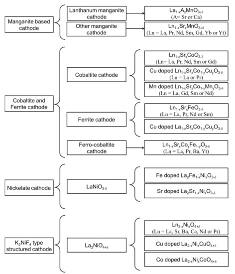 Considering the high operating temperature and activation energy associated with the ORR on the cathode side of an SOFC, the choice of cathode is limited to platinum, gold, and silver []. However, noble materials are unsuitable for practical applications because of their high cost, poor compatibility with the electrolyte, and generation of a volatile oxide (POx) during high-temperature oxidation []. Therefore, perovskite-structured materials have been widely used as cathode materials in SOFCs. A list of various cathode materials used in SOFCs is presented in Figure 2. The most promising cathode for high-temperature SOFC is strontium-doped lanthanum manganite (LSM) []. However, the LSM cathode shows high polarization resistance at a reduced temperature because of its high activation energy for ORR, making it unsuitable for intermediate-temperature (IT) SOFCs below 800 °C []. Thus, alternative cathode materials for SOFCs operating at reduced temperatures have recently attracted considerable research attention.