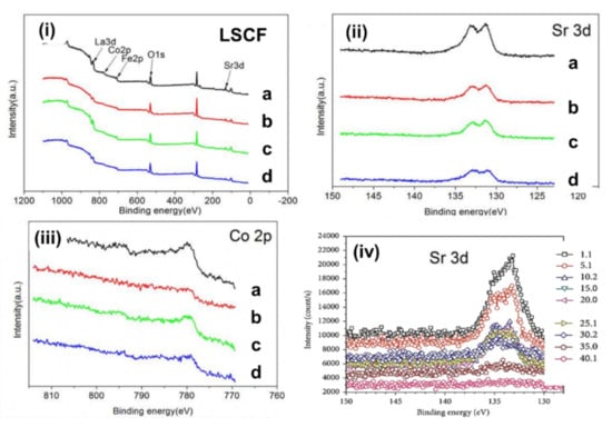 (i) XPS spectra of LSCF, showing La 3d, Sr 3d, Co 2p, and Fe 2p peaks (ii) magnified image of Sr 3d peak (iii) magnified image Co 2p peak for (a) as-prepared sample, (b) under open circuit at 750 °C in the air for 120 h, (c) polarized sample under 100 mA cm−2 at 750 °C for 120 h, and (d) polarized sample under 200 mA cm−2 at 750 °C for 120 h. (iv) Sr 3d peaks obtained from XPS depth profile measurements at different depths in micrometers (((i–iii) reprinted with permission from Reference [], copyright Elsevier, 2018) and (iv) reprinted with permission from Reference [], copyright Hindawi, 2018).