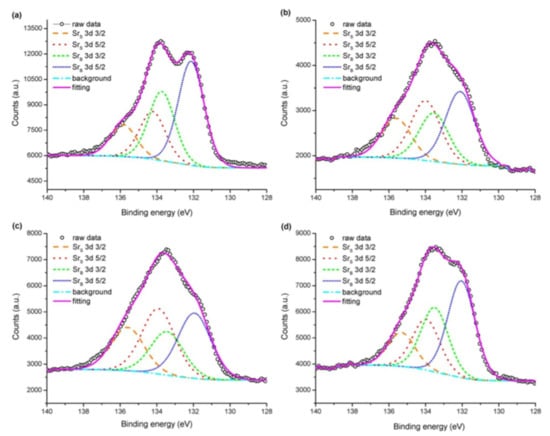 Pan et al. [] studied the effect of Sr surface segregation of LSCF electrode on its electrochemical performance by using XPS. Peak fitting on XPS spectra of Sr was conducted to confirm the surface segregation of Sr based second phase other than that of LSCF perovskite and compared the XPS spectra of raw LSCF powder, freshly pre-pared LSCF electrode, LSCF electrode after annealing for 24 h, and nitric acid-treated LSCF electrode after annealing (Figure 5). The 3d spectrum of Sr shows the coupling of 3d3/2 and 3d5/2 spin orbits, resulting in a doublet state. Peak fitting of Sr 3d spectrum resulted in the extraction of two pairs of Sr 3d3/2 and Sr 3d5/2 spin orbits. The pair with lower binding energy was denoted by SrB, which is located in bulk bound Sr, while Sr denotes the pair with higher binding energy present on the surface of the LSCF electrode.