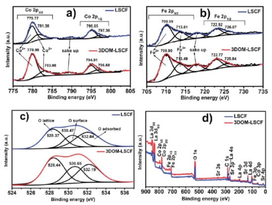 Ha et al. [] performed XPS of LSCF and 3DOM-LSCF (three-dimensionally ordered microporous LSCF) and found that both Co and Fe show two coexisting oxidation states (Figure 6). The B-site in the perovskite is occupied by Fe or Co in either 2+ or 3+ oxidation states. Furthermore, peak fitting for Fe 2p orbital was conducted within Fe2+ and Fe3+ component constraints and their respective satellites. The higher binding energy of iron denotes Fe3+ (Figure 6b). In addition, Co2+, Co3+, and their respective satellites were used to fit the Co 2p region. However, in this case, the higher binding energy is attributed to Co2+. The oxygen XPS spectra are shown in Figure 6c, which depict the lattice, surface, and adsorbed oxygen with increasing binding energy, respectively.