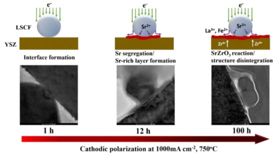 The performance and long-term structural stability of the LSCF cathode under various SOFC operational conditions have been extensively studied []. Figure 10 shows the segregation of Sr cation and formation of insulating phase SrZrO3 at the LSCF/YSZ interface as a function of polarization time at 100 mA cm−2 and operating temperature of 750 °C []. This electrically insulating Sr-rich layer de-activates the oxygen diffusion kinetics and blocks the migration of oxygen ions at the cathode/electrolyte interface, thus affecting the electrical conductivities of the LSCF cathode [,]. It also alters the thermal expansion coefficient of the cathode/electrolyte layers, thereby affecting the mechanical stability of the interface []. This segregation or enrichment of cations is caused by the mismatch of the ionic radii between the dopant Sr2+ (1.44 Ǻ) and the host La3+ (1.36 Ǻ) [,]. Moreover, the electrostatic attraction between these ions produces a strong Columbic attraction that drives the dopant cations to the positively charged interface and causes the dopant Sr2+ cation to segregate toward the surface. At the LSCF surface, the concentration of Sr cations increases with the decrease in partial oxygen pressure and increasing operating temperature [].
