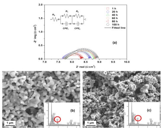 (a) EIS spectra as a function of thermal treatment time measured at 600 °C and FESEM surface images and EDX spectra of LSCF cathode (b) before and (c) after the thermal treatment. (Reprinted with permission from Reference [], copyright Springer Nature, 2019).