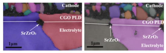 Electrochemical polarization and fuel cell operating conditions significantly contribute to the formation of SrO and the migration of Sr cations to form an oxygen ion-blocking layer (SrZrO3 phase) at the cathode/electrolyte interface. Considerable efforts have been made to avoid surface segregation and interaction between the LSCF and YSZ to improve long-term structural stability and electrocatalytic activity for ORR. A dense barrier layer of the doped ceria-based electrolyte between LSCF and YSZ can be used to minimize the reaction between segregated Sr and YSZ under the cathodic polarization treatment (Figure 12). However, this approach cannot completely eliminate the formation of the resistive SrZrO3 phase at the LSCF layer and at the doped ceria/YSZ interface (Figure 12) because of the presence of an open porosity and the subsequent densification with the ceria-based interlayers at low sintering temperatures. In general, the GDC interlayer at the top of the pre-sintered YSZ electrolyte must be sintered below ~1200 °C to prevent GDC and YSZ from forming high-temperature chemical reactions. Densifying the interlayer at low sintering temperatures seems impossible because of the refractory aspect of ceria. However, this open porosity in the interlayers must be reduced to prevent the formation of an undesired chemical substance at the interlayer and the cathode/electrolyte interface and to restrict the Sr cation migration from the cathode to the zirconia-based electrolyte materials [,].