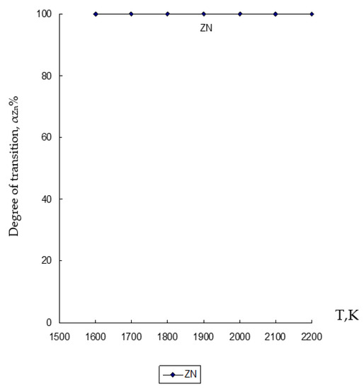 From the results obtained in the chemical and phase modeling carried out under the conditions of the ZnO∙SiO2-FeO∙Fe2O3-C system, it is clear that zinc (Zn) completely passes into the gas phase with a 100% degree of transition in the entire set temperature regime (Figure 2).