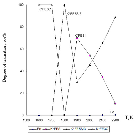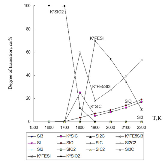 The degree of distribution of silicon (Si) in the ZnO∙SiO2-FeO∙Fe2O3-C system into iron-containing compounds of the condensed phase is shown in Figure 4. Figure 4 shows that the degree of Si transition to the alloy reaches up to 59.88% for the compound formed as Fe5Si3 at 1800 K, and up to 69.44% for the compound formed as FeSi at 1900 K.